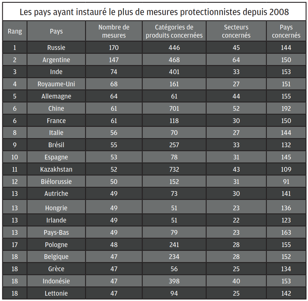 Dans les pays recensés pour protectionnisme, le haut du tableau est squatté par les pays les plus libéraux. Il y a également quelques émergents qui tentent avec ces mesures de garder leur position de pays en plein essor économique. L’Argentine et l’Inde se sont donc montrées particulièrement prévenantes en protégeant leurs intérêts. Ils occupent respectivement la seconde et troisième place de ce classement établi par le Global Trade Alerte. Si la Russie reste la championne du protectionnisme avec 1702 mesures prises, Royaume-Uni, Allemagne, Chine, France, Italie, Brésil et Espagne complète ce tableau des dix pays les plus frileux, ce qui n’a pas empêché certains de sombrer dans un marasme économique et d’en arriver aux mesures d’austérité.