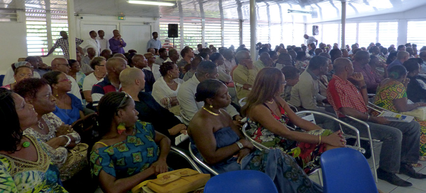 Viennent les questions concernant l’intercommunalité, gros morceau des prochaines élections. Sur ce sujet, c’est Fred Deshaiyes, en sa qualité de politologue, professeur à l’UAG qui prend la barre face à un auditoire généralement attentif. Il sera interrompu par l’arrivée de Paul Larifla applaudit par les militants et élus. Quand il reprend la parole, l’universitaire insiste surtout sur la nécessité de changer de modèle de campagne politique. Plus d’attaques personnelles – un rire traverse l’assemblée – mieux vaut afficher dès le départ son soutien au maire qui aura le plus de chances de prendre la tête de l’intercommunalité fût-il d’un courant politique adverse. Avec l’intercommunalité, viennent les enjeux en tiroir dont les municipales ne sont que l’entrée en matière. Jacques Gillot Guy Losbar et Camille Pélage hochent sagement la tête… ils semblent avoir déjà assimilé le concept. À l’annonce des candidatures, l’ambiance s’échauffe, les militants sifflent et applaudissent chaque candidat, l’ovation étant bien sûr réservée à Guy Losbar qui arrive à peine à faire entendre son discours de clôture qu’il termine par un vibrant ” Vive la Guadeloupe et Vive Petit-Bourg !” Le doute n’est plus permis. Quand les ” Vive ” sont dehors, alors les élus battent réellement la campagne…