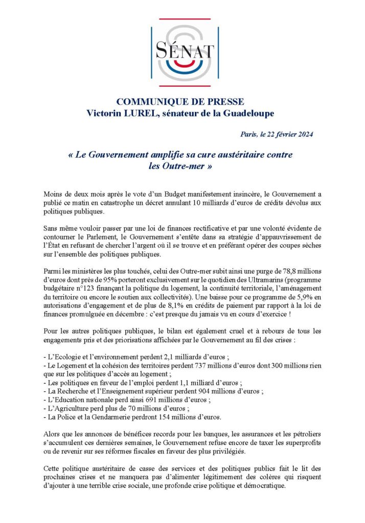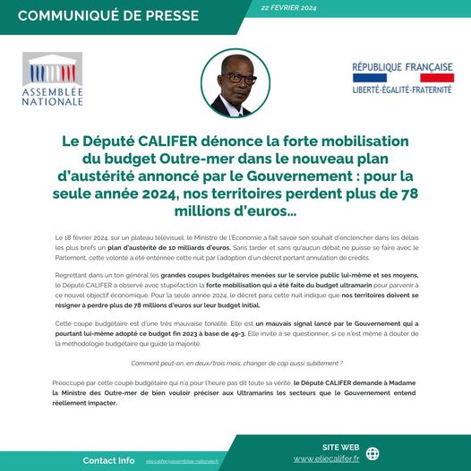 « Comment peut-on, en deux/trois mois, changer de cap aussi subitement ? Cette coupe budgétaire est d’une très mauvaise tonalité. Elle est un mauvais signal lancé par le gouvernement qui a pourtant lui-même adopté ce budget fin 2023 à base de 49-3. Elle invite à se questionner, si ce n’est même à douter de la méthodologie budgétaire qui guide la majorité » s’interroge le député de la 4e circonscription de Guadeloupe Elie Califer.
