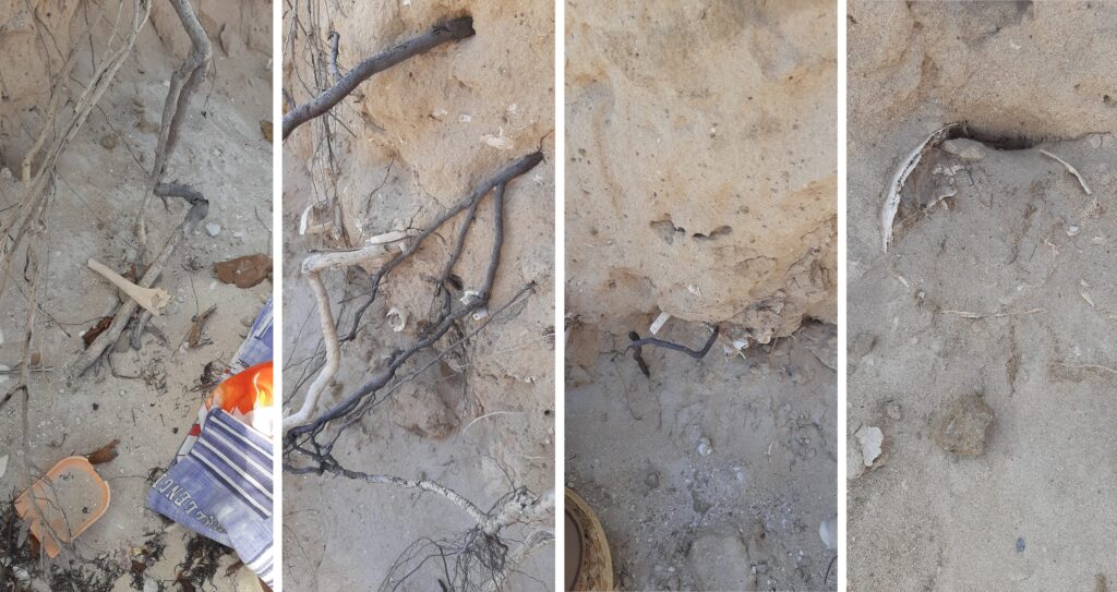 En Guadeloupe, “4 400 sites archéologiques sont recensés et parmi eux, 800 se situent à moins de 100 mètres du bord de mer” explique Monsieur Modat, donnant l’exemple de la plage très touristique de la commune de Saint-François, les Raisins clairs. Là, l’érosion a mis au jour au début des années 2010 un ancien cimetière d’esclaves, et les serviettes de plage tutoient les ossements qui affleurent (photo ci-dessus).