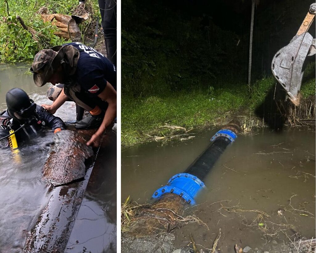 La réparation de la canalisation d’alimentation de Belle-Eau Cadeau réalisée sur un terrain marécageux de Goyave situé entre Moreau et Fort l’île s’est révélée une opération délicate, difficile, exigeante. Il a fallu d’abord localiser la panne. Ce sont les habitants en bordure du site qui ont donné les informations. Ils ont signalé la présence anormale d’une eau claire qui imbibait la mangrove.