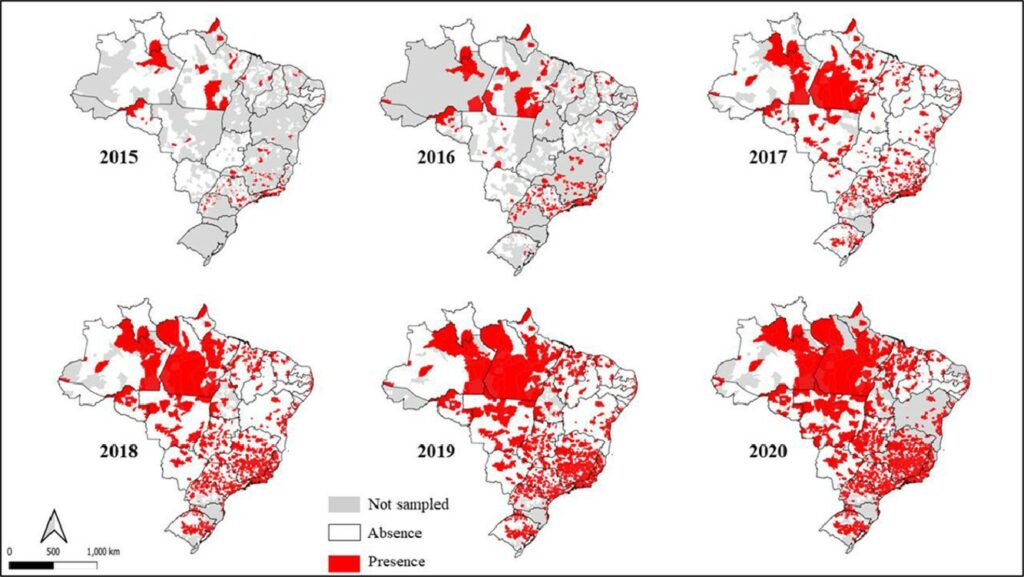 Dans le pays voisin, le Brésil, le moustique tigre a réussi à coloniser presque l’intégralité des 8 516 000 km² du territoire en moins de cinq ans, entre 2015 et 2020 (voir cartographie ci-dessous). Ce géant de l’Amérique latine est environ 5 232 fois plus grand que la Guadeloupe en superficie.