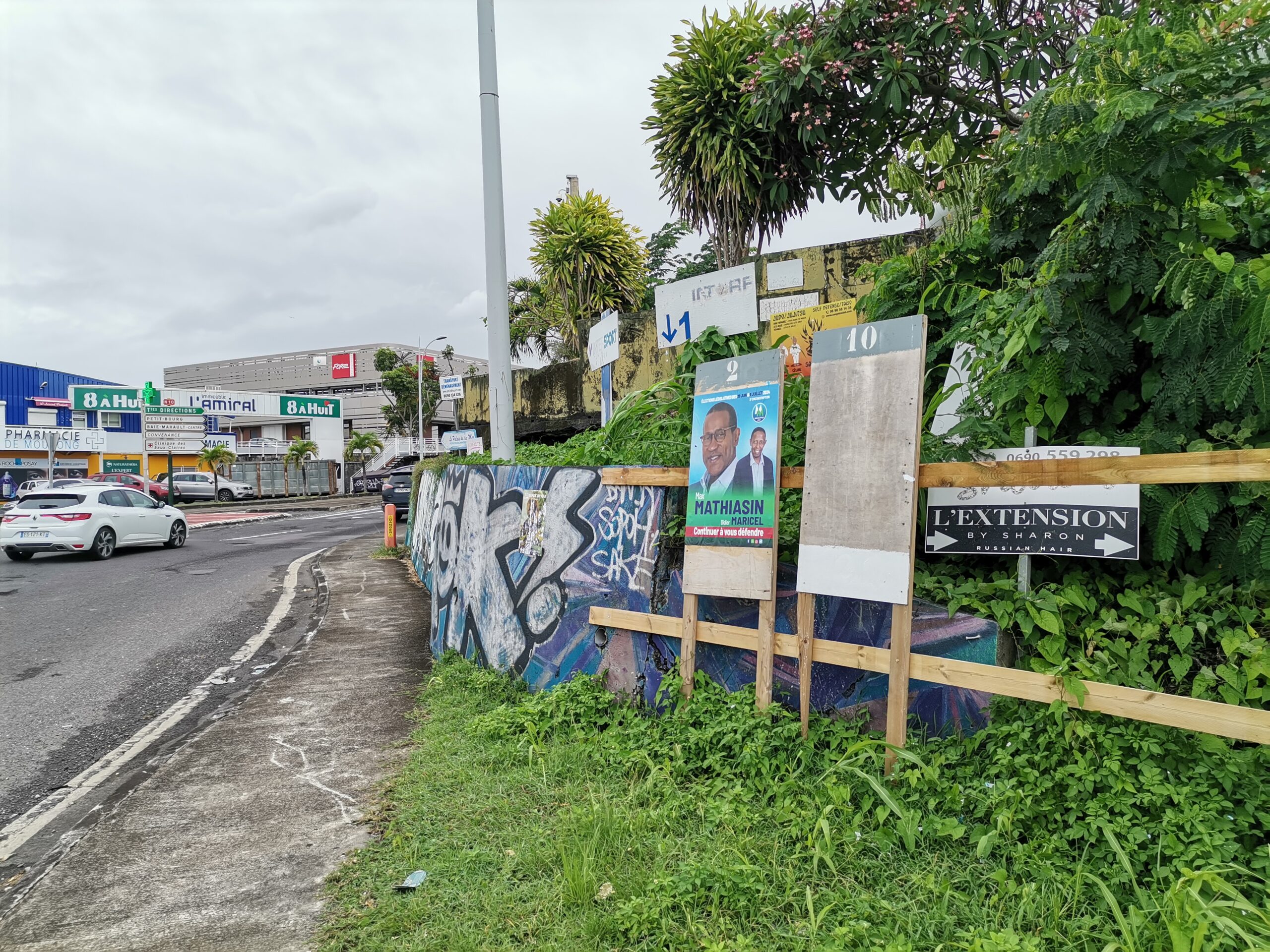 Les panneaux sont donc réduits au nombre de 2 candidats, comme sur la photo ci-dessus prise mercredi 3 juillet à Moudong, Baie-Mahault, dans la 3e circonscription, la plus scrutée de Guadeloupe, où s’affrontent le député sortant centriste Liot Max Mathiasin, et le candidat d’extrême droite du Rassemblement national Rody Tolassy.
