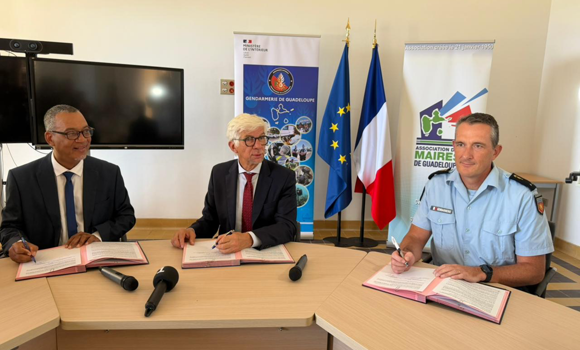 En matière de police administrative et judiciaire, un nouveau pont s’est créé entre l’administration d’État et l’administration territoriale. Un rapprochement entre la gendarmerie nationale et l’association des maires de Guadeloupe présidée par Jocelyn Sapotille (à gauche), sous l’égide du préfet Thierry Devimeux (au centre), a été signé mardi 13 janvier à Basse-Terre. L’objectif affiché est de renforcer la coordination entre forces de sécurité et ces élus locaux particuliers que sont les maires qui cumulent la qualité de représentants de l’État à l’échelon communal placés sous la hiérarchie des préfets. La zone gendarmerie qui concerne les zones rurales, couvre 28 des 32 communes de l’archipel, soit 91,5 % du territoire et 71,75 % de la population. La zone police concerne les points très chauds.