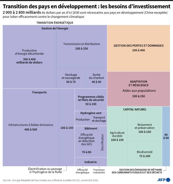 Cette aide, qui doit être rehaussée dès 2025, n’est pourtant qu’une fraction du nécessaire: plus de 2 000 milliards de dollars seront requis chaque année d’ici 2030 pour financer l’adaptation au changement climatique et le développement de ces pays, selon un groupe d’experts des Nations unies.