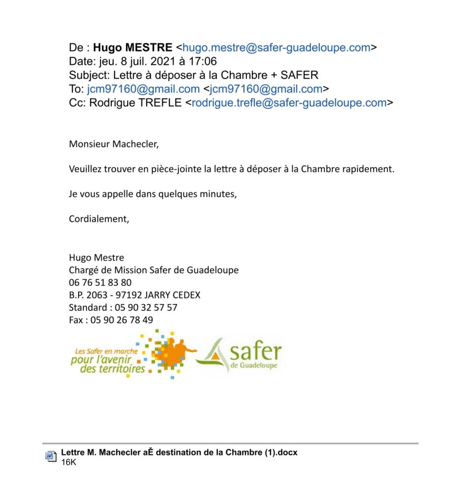 Un élément vient appuyer cette hypothèse : un mail daté du 8 juillet 2021, envoyé par Hugo Mestre, alors chargé de mission à la Safer. Le message, adressé à Jean-Claude Machecler, contenait en pièce jointe une lettre à déposer à la Chambre d’agriculture. « Monsieur Machecler, Veuillez trouver en pièce-jointe la lettre à déposer à la Chambre rapidement. Je vous appelle dans quelques minutes, cordialement » avait signé Hugo Mestre. Le PDG de la Safer, Rodrigue Trèfle, était en copie de cet envoi. Ce courrier, version très proche de la lettre manuscrite attribuée à Monsieur Machecler, confirme l’implication directe de la Safer.