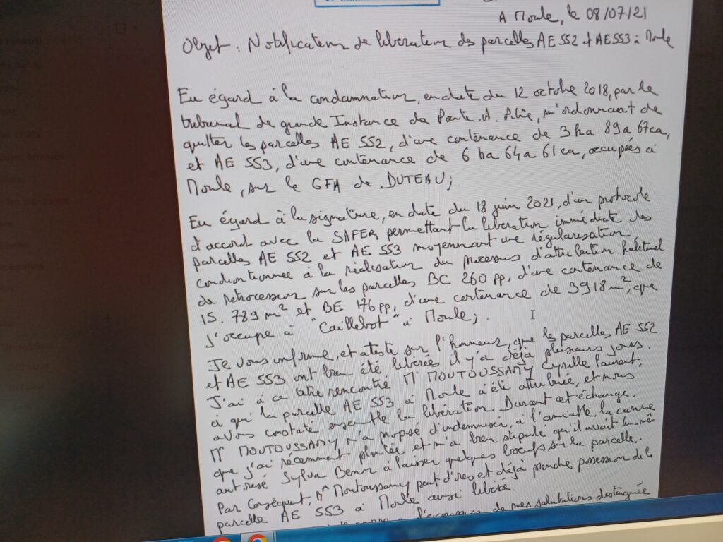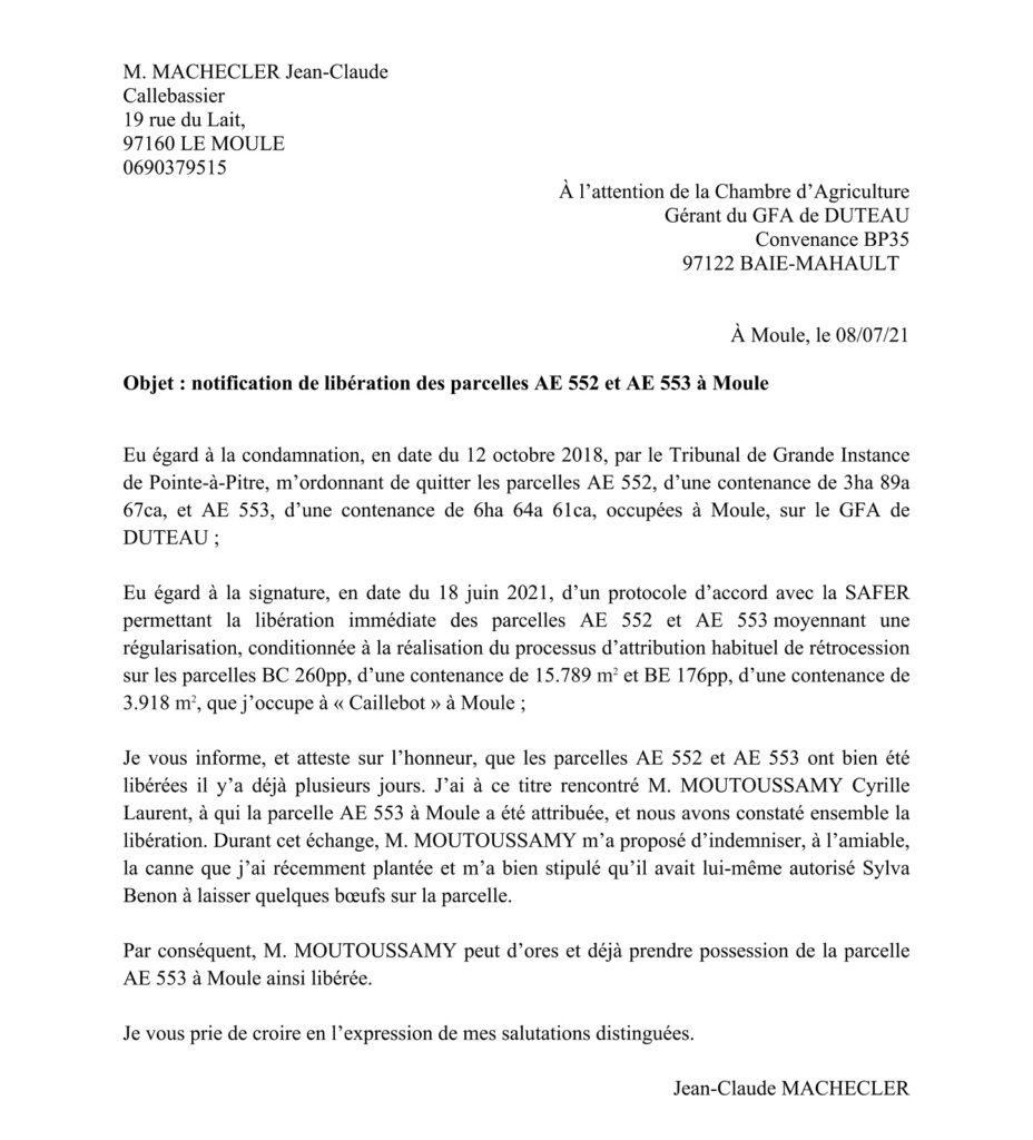 Deux lettres manuscrites attribuées à Jean-Claude Machecler, datées des 8 et 9 juillet 2021, ont été présentées au comité. Dans la première, Monsieur Machecler affirme avoir libéré les parcelles AE 552 et AE 553 après un accord avec la Safer, en échange d’une régularisation sur d’autres parcelles qu’il occupe. Il y évoque également une rencontre avec Cyrille Moutoussamy, qui aurait proposé de l’indemniser pour la canne qu’il avait plantée.