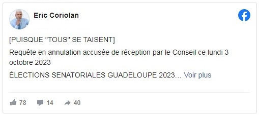 Eric-Coriolan-Senatoriales-Guadeloupe-Requete-en-annulation-pour-irregularites-1L’action qui a été moquée par des observateurs soulignant la qualité de ‘simple citoyen’ d’Éric Coriolan, s’appuie sur la règle selon laquelle « le Conseil constitutionnel peut être saisi par toutes les personnes inscrites sur les listes électorales de la circonscription dans laquelle a été élu le député ou le sénateur dont l’élection est contestée. »