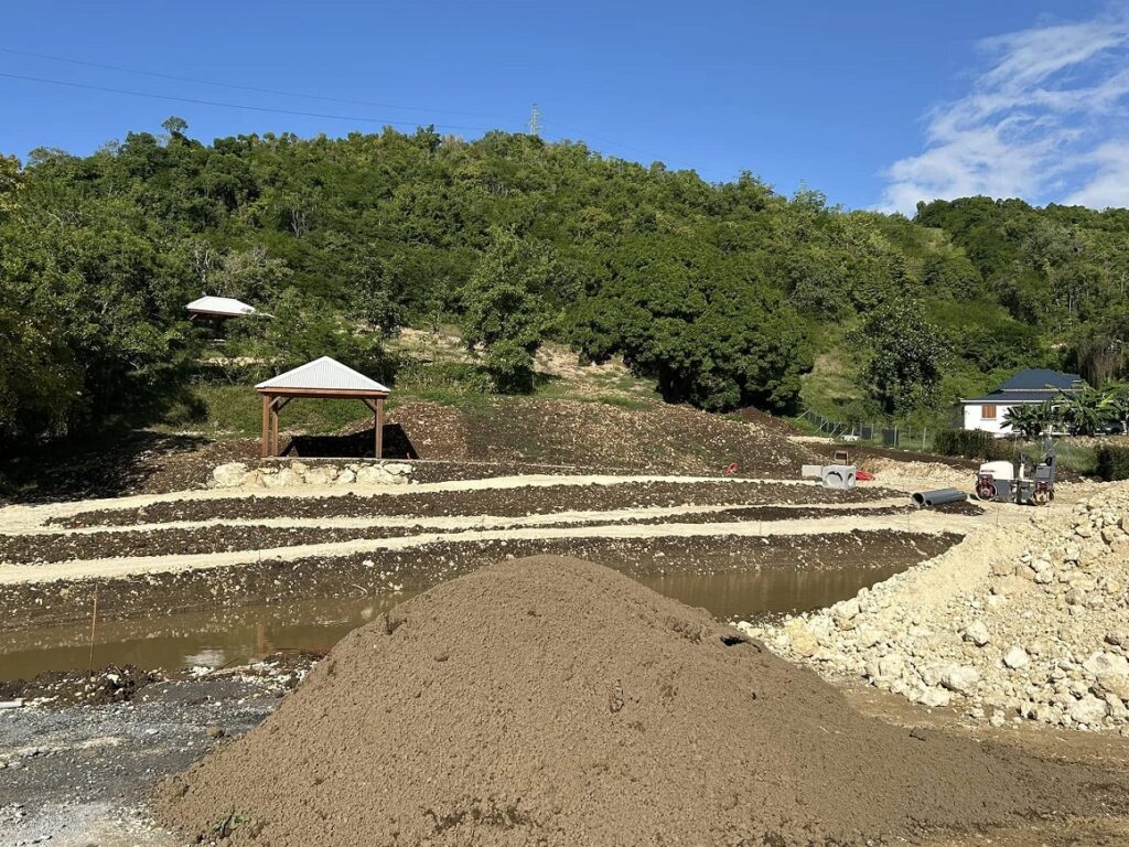 Deux carbets sont visibles, achevés par l’entreprise Coalys Guadeloupe fière de pouvoir montrer les belles charpentes traditionnelles. L’entreprise qui a la charge des constructions bâties bois pour un coût de 128 750 euros se réjouit du « bel espace naturel aménagé à venir ! » Les autres dépenses incluent 732 184 euros pour les travaux de terrassement et de voirie confiés à la société BMJ, 23 920 euros pour des aménagements paysagers réalisés par TPRB Environnement, et 53 000 euros pour l’ingénierie et la planification assurées par le cabinet Vialis Ingénierie.