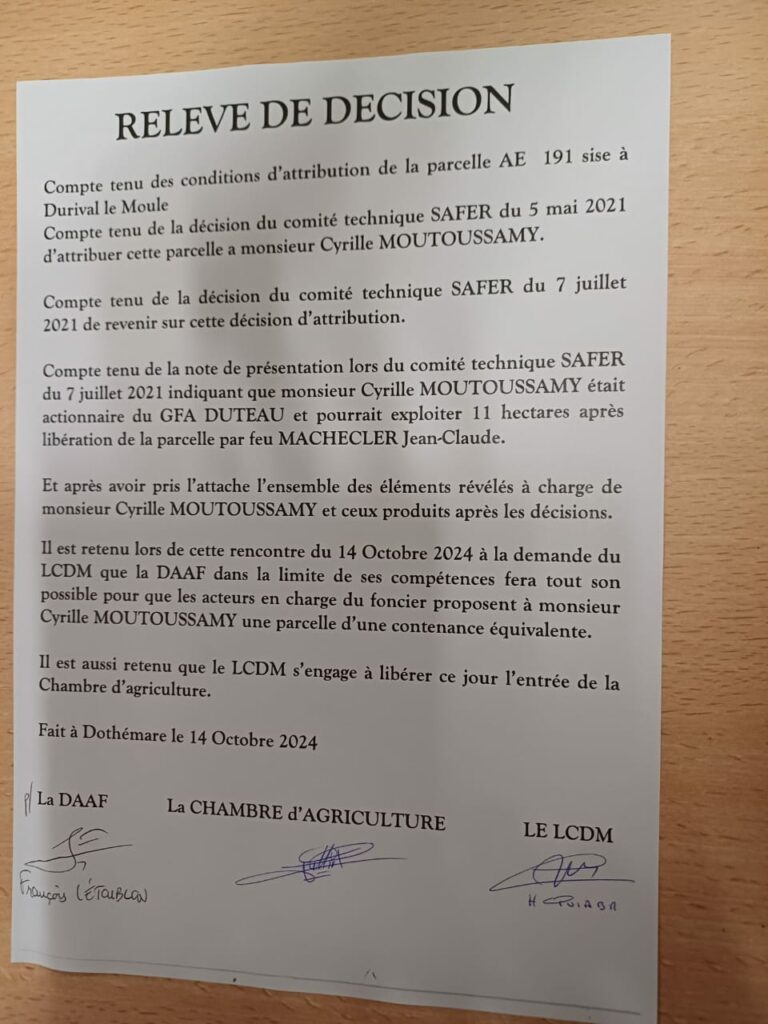 À la suite de la réunion du 14 octobre, la Daaf s’engage dans un relevé de décisions à « dans la limite de ses compétences de faire tout son possible pour que les acteurs en charge du foncier proposent à Monsieur Cyrille Moutoussamy une parcelle équivalente à celle qui lui avait été attribuée au départ ». L’entrée de la Chambre d’agriculture est libérée par le LCDM dès le lendemain 15 octobre, comme le prévoyait le relevé de décisions.